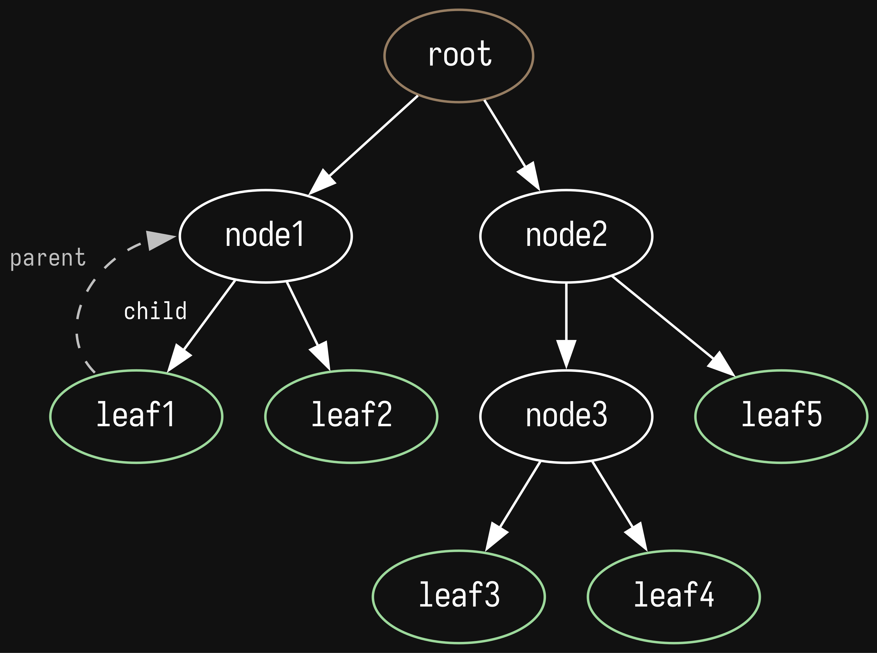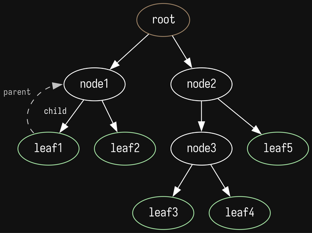 you can think of it as a hierarchy where everything points down, starting from the root node. each node points to its children and the node that pointed to the current one is called the parent. nodes can have only one parent, except for the root, which has none. nodes with no children are called leaves.
