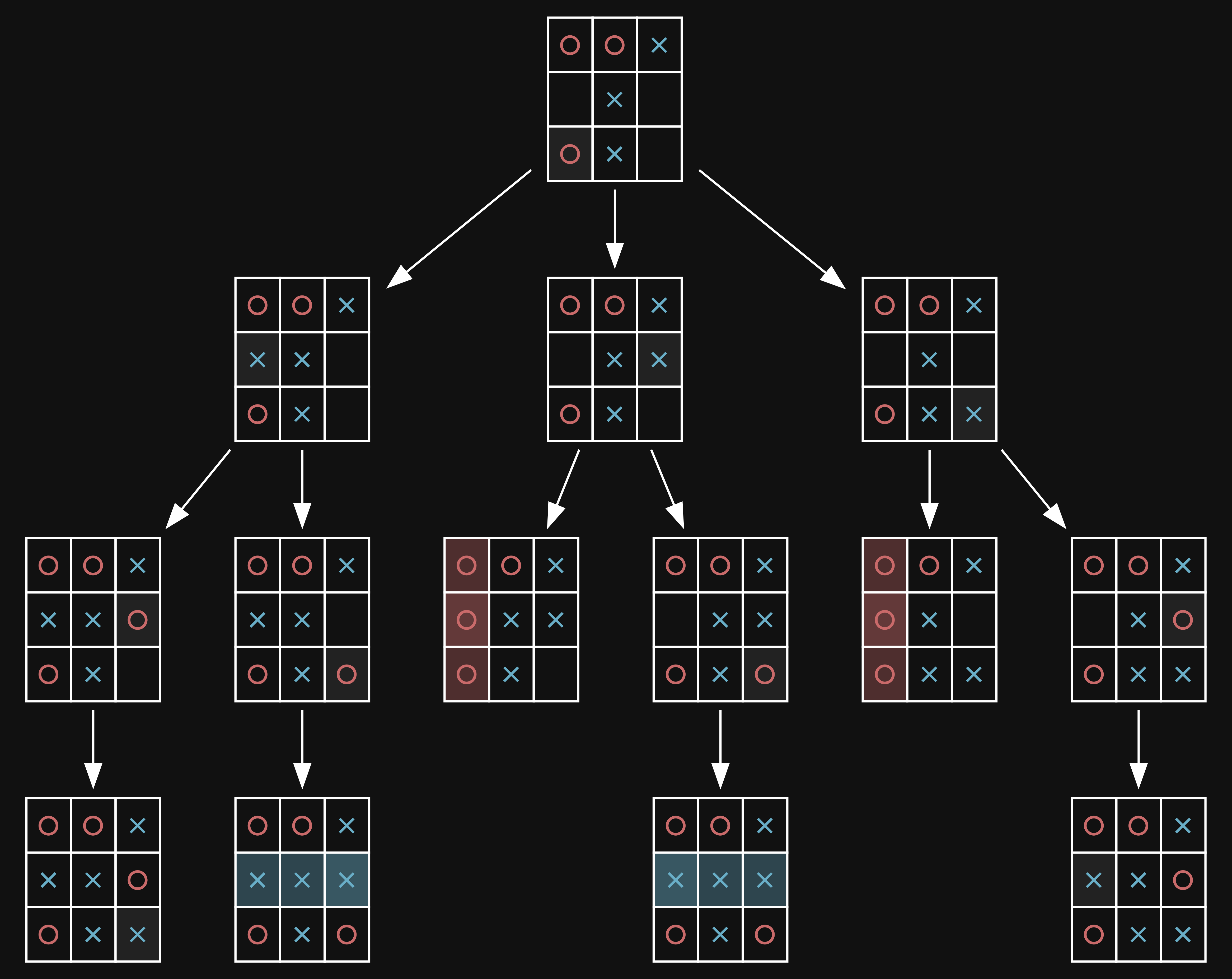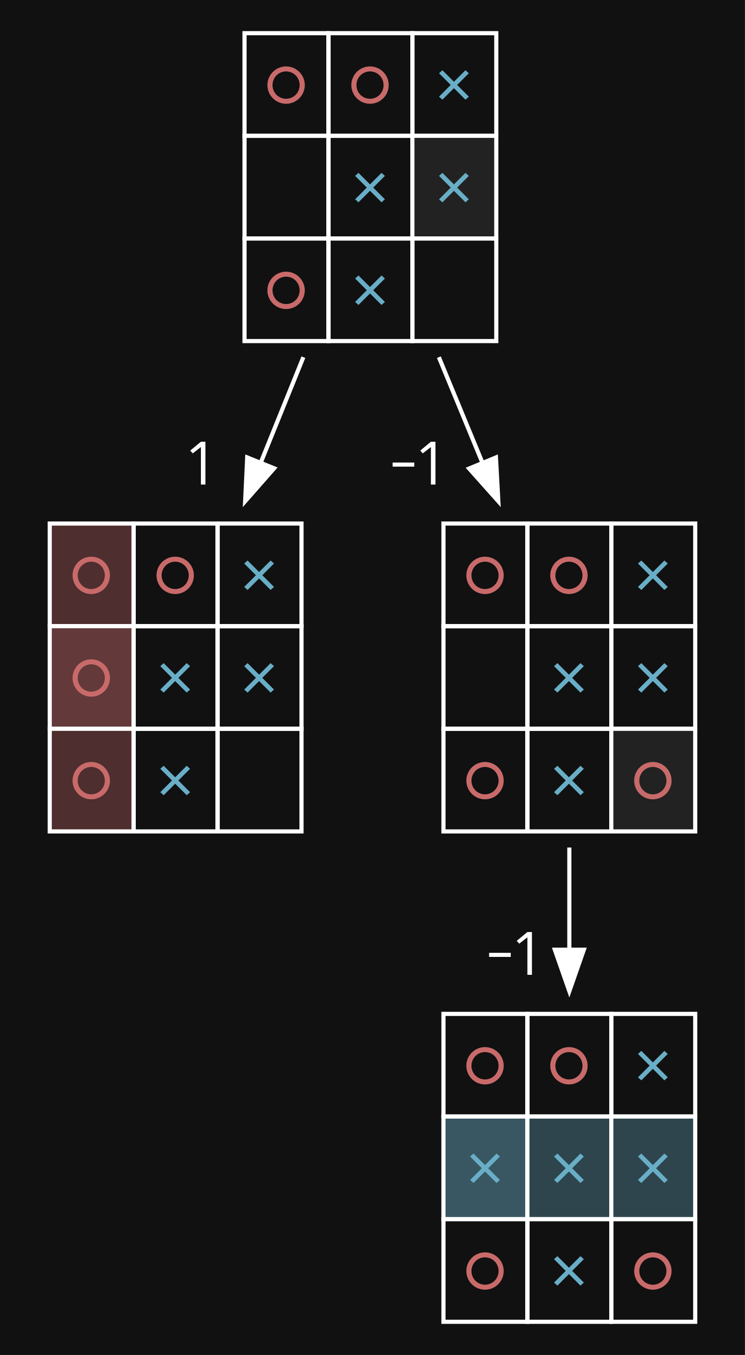 here is an example where it's O's turn. O's win has a value of 1 since we're playing as them, so X's win is assigned a value of -1. then that node's parent is a state where it's X's turn, so it finds the minimum value (its only one value), and sets it as its own. finally, all values are calculated so we pick the root child with the highest value, and that's the left branch, winning us the game. feel free to try this out on the previous diagram to get a bit more of an idea of how this algorithm works (it's X's turn this time).