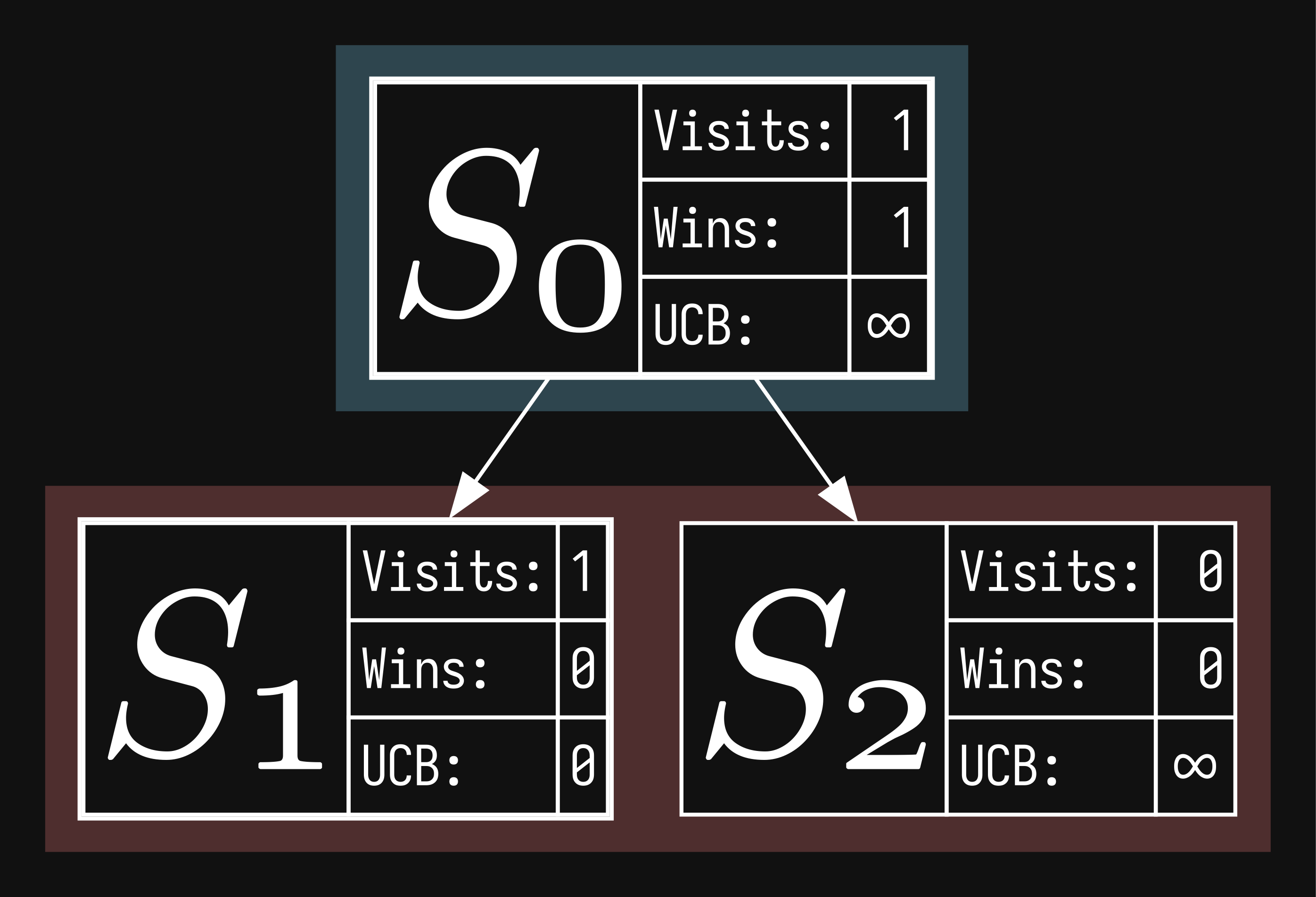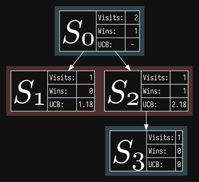 where is the number of wins at the current node, is the number of visits at the current node, and is the number of visits that the parent of the node has. the first component is the exploitation term - it's just the win rate, good moves have higher win rates, so we'd like to develop them, the other component, the exploration term is a bit more complicated. the main intuition behind it is that increases as the node's siblings (other children of the parent) get visited. the rest is derived from the multi-armed bandit problem. the last part is , the exploration parameter, which is a constant controlling the balance between exploration and exploitation. in theory it's , but in practice it's tuned. now we can update all the values in the tree: