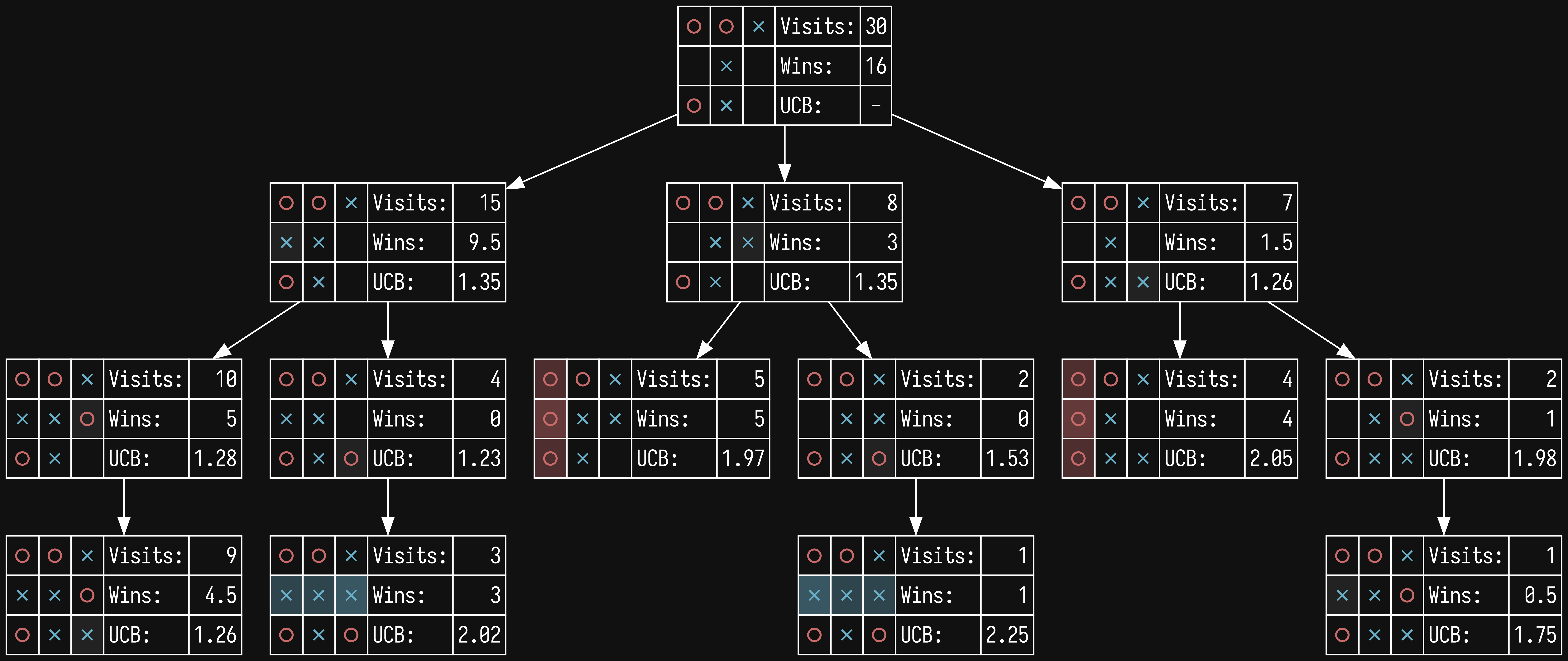you can see how the exploitation term is winning out on the first row, because both nodes are equally explored. on the next round will be selected, then and expanded, then simulated, on and on and until we decide to stop (usually after a set time). for instance, here's our original game tree but with 30 rounds of mcts ran on it