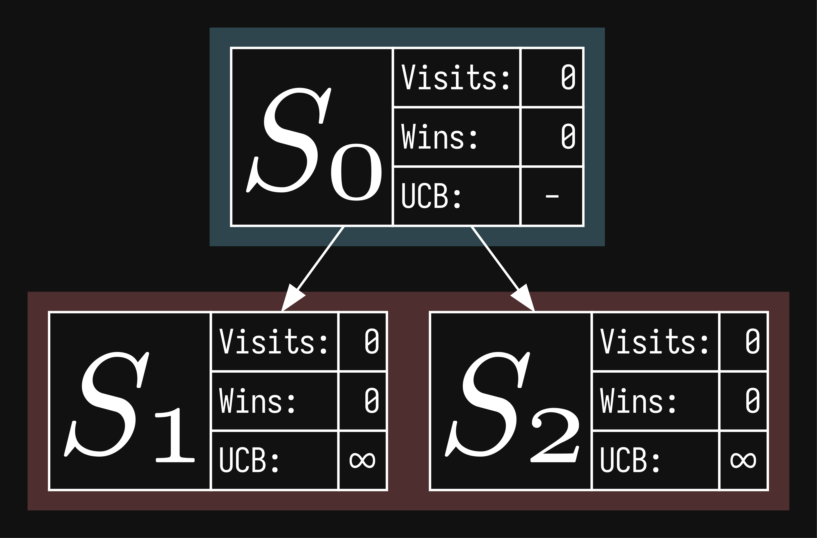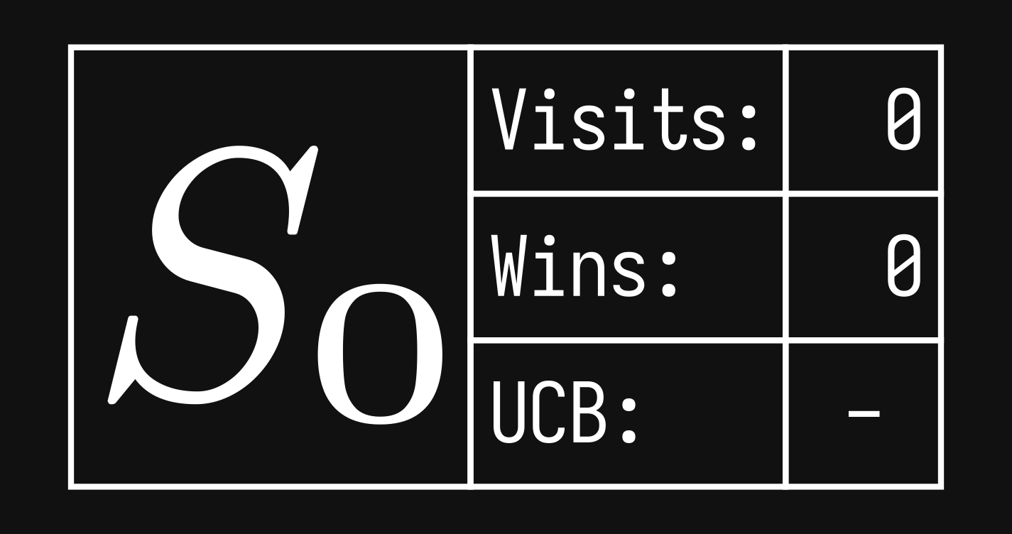 monte carlo tree search uses random sampling to approximate the minimax game tree (even though it only converges to it in "monte carlo perfect" games, which require random turn order). a perk of this, is that you can stop the search at any time, but of course leaving it running for longer gives better results. mcts works in discrete steps called rounds (or iterations), each round consisting of 4 phases. to illustrate the algorithm, i will be abstracting the game state to ( as in index). it can be literally anything - tic-tac-toe, chess, go, all the concepts will still apply. let's start with just the root node, and you'll notice that we've given it some values, which will talk about at the end