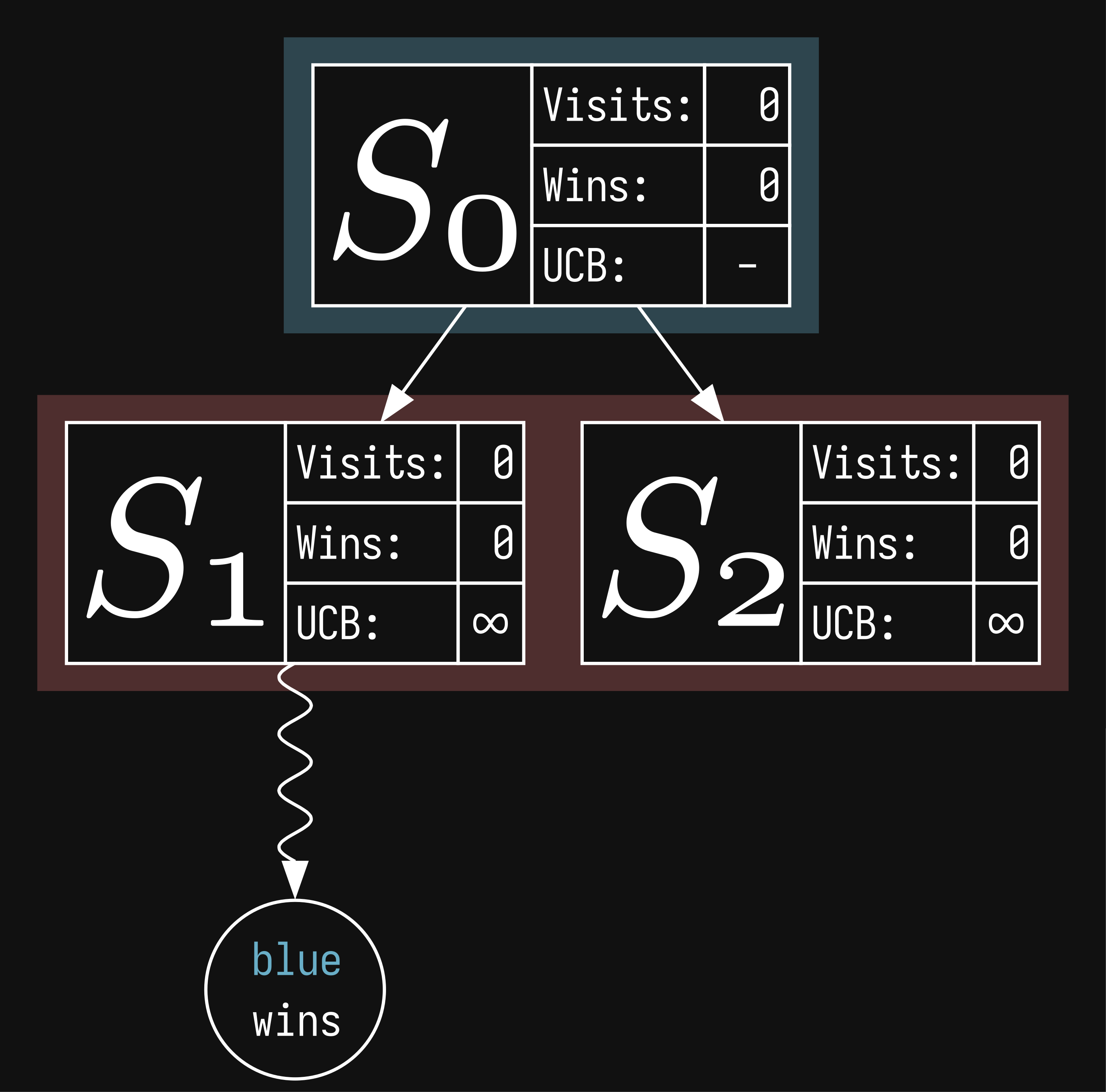we start from our node, and successively get the parent (walk up the tree) until we reach the root. for each node we reach, we increment the visits and then increment the wins only if the winner just played at that node. hence in this example, even if it's the red player's turn at , it's going to be updated because blue just played. if you think back to minimax, when we're at a node that's our turn, we want to choose the move that maximizes our score. in this way, we'll let the algorithm calculate the win rate correctly as you'll see in the following step. in this example, only the root node gets a win. ties actually also work in the same way, just adding only 0.5 instead. this incentivizes our bot to prolong games, even if it knows it's going to lose. and now the final third value, ucb:
