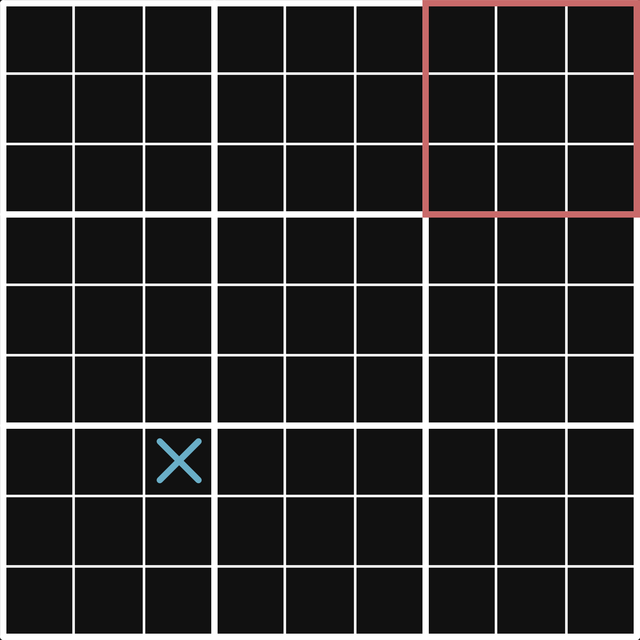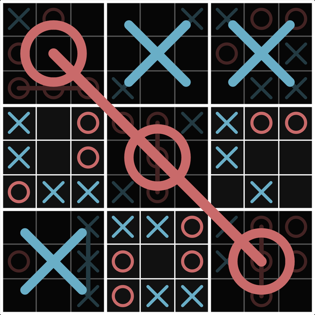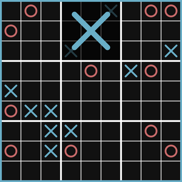 or "ultimate tic-tac-toe", which seems to be the more common name but i think this one is cooler. i saw a classmate playing this once which is what inspired me to do this whole thing. it's just difficult enough that i can't just brute force all positions, but just easy enough that i don't have to worry about complex game states or the game tree growing too fast. the rules are the following:
