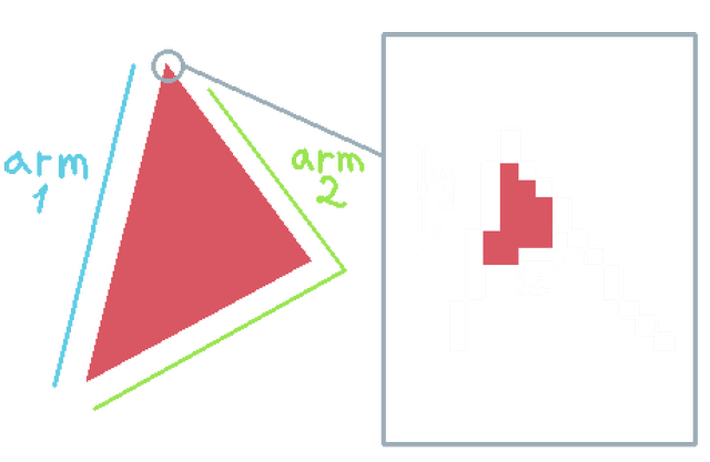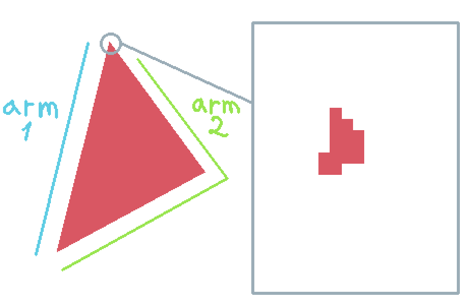 now we have to figure out how to draw a triangle on a grid of pixels. we'll use a somewhat intuitive approach, where we just draw between two "arms" of the triangle