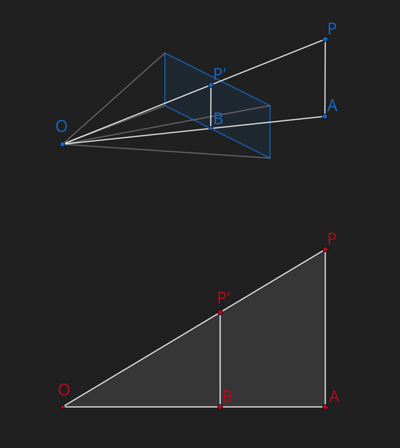 being the projected dimension, the actual dimension, the focal length , and the z of the point, we get the following two equations